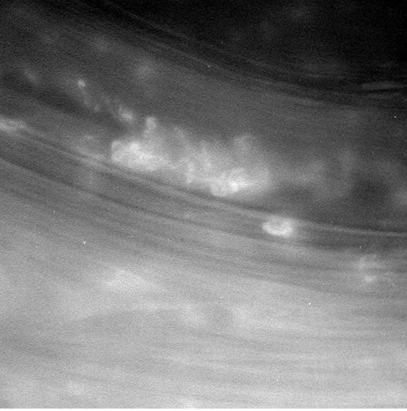 ۶ اردیبهشت ۱۳۹۶: فضاپیمای کاسینی از جو زحل که در این‌جا نزدیک‌تر از همیشه دیده می‌شود، عکس گرفته است. این عکس در طول اولین گذر فضاپیما از این سیاره گرفته شده است.